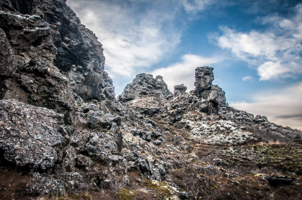 Na p贸艂noc od jeziora M媒vatn znajdziemy powulkaniczny teren, kt贸rego widok o zmierzchu przyprawia o dreszcze - Dimmuborgir, czyli mroczne fortece. S膮 to labirynty utworzone z zastyg艂ej lawy. Napotkamy pe艂no jaski艅, w膮woz贸w, szczelin oraz niezliczona ilo艣膰 pag贸rk贸w.