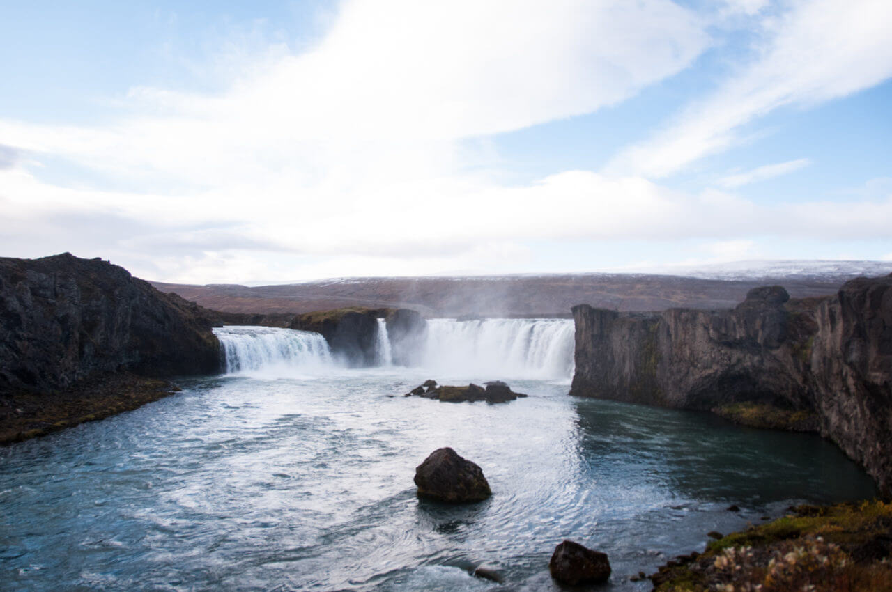 Jad膮c dalej w kierunku miasta Akureyri mijamy wodospad Go冒afoss zwany wodospadem bog贸w. Jest on w kszta艂cie podkowy a nazw臋 swoj膮 wzi膮艂 od bo偶k贸w poga艅skich, kt贸rych posagi zosta艂y wrzucone do wodospadu podczas chrystianizacji Islandii.