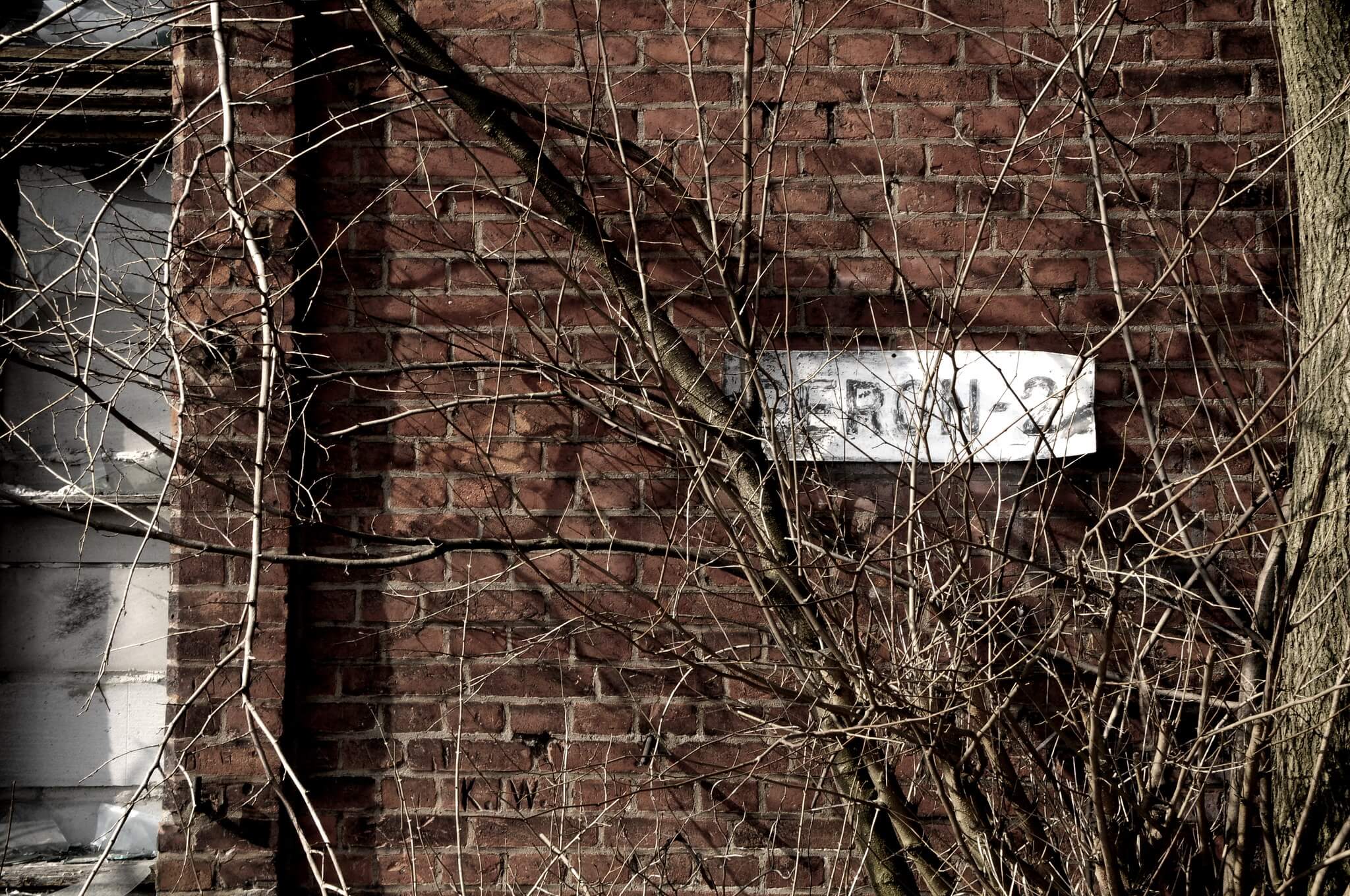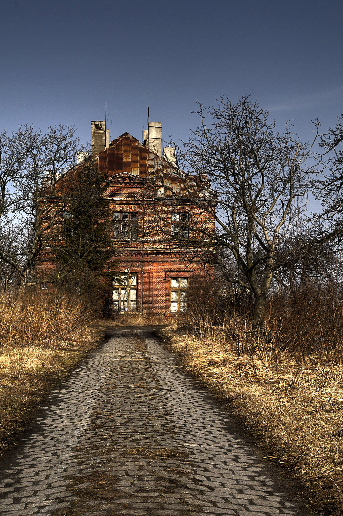 Id膮c po brukowanej dr贸偶ce zza krzak贸w wy艂ania si臋 nam pi臋trowy budynek z czerwonej ceg艂y. Czas odcisn膮艂 na nim swoje pi臋tno. Mimo, 偶e kiedy艣 kilka rodzin wynajmowa艂o tam mieszkania, dzi艣 budynek stoi w op艂akanym stanie.